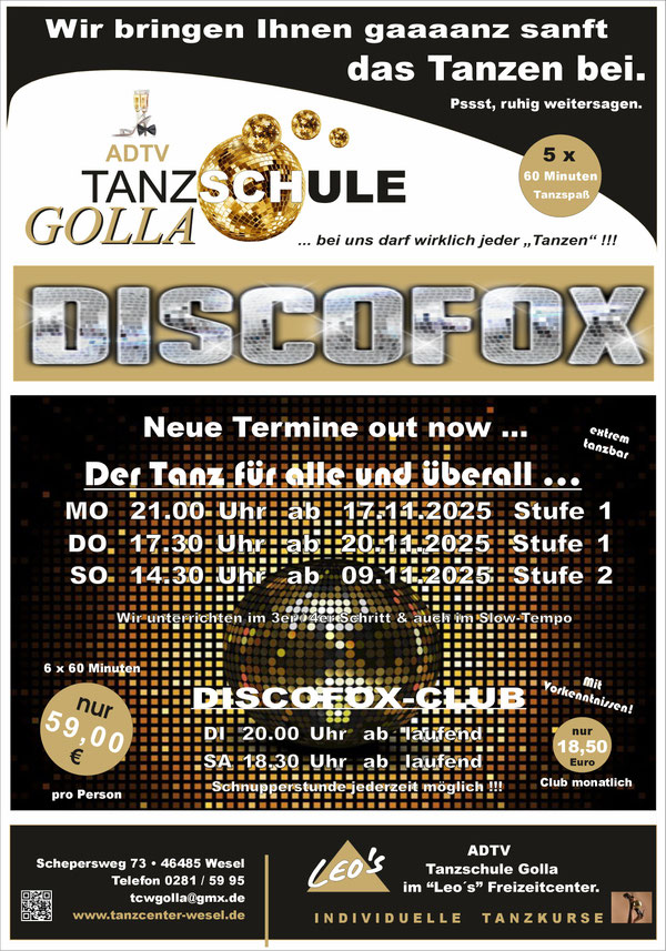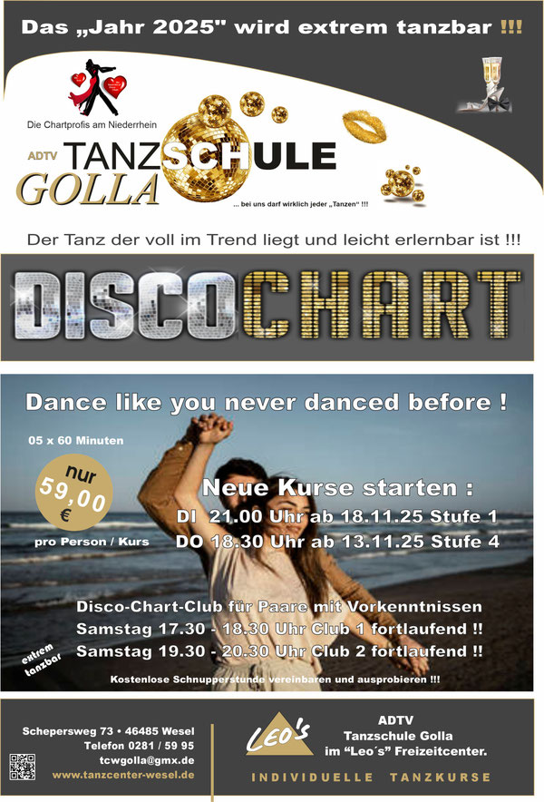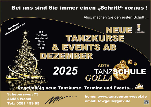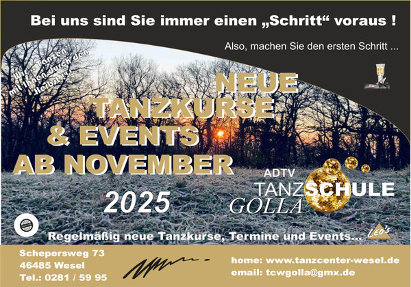 +++ Die 2. Hälfte des Tanz-Jahres 2025 läuft auf vollen Touren, also Zeit um sich neu zu orientieren !!! +++ Wir starten 2025 so richtig durch !!! +++ Das 2. Tanzhalbjahr 2025 wird einfach grandios !!! +++ Neue Tanzkurstermine ab November 2025 in Kürze online! Schnell schon Kursplatz sichern!!! +++ Neuer Veranstaltungskalender online ! +++ Wir haben das richtige Geschenk für alle Gelegenheiten: "Geschenkgutscheine" für alle Gelegenheiten jederzeit im Büro erhältlich!!! +++ Gutscheine auch Online buchbar +++ Nächstes Event: "Alle Tanz-Parties und Events finden natürlich wieder wie gewohnt statt!!! " +++ Die Geschenkidee!!! Wie wäre es mit einer Privatstunde nach Wahl??? +++ Wir wünschen allen Besuchern unserer Homepage viel Spaß beim Stöbern auf unserer Homepage !!! +++