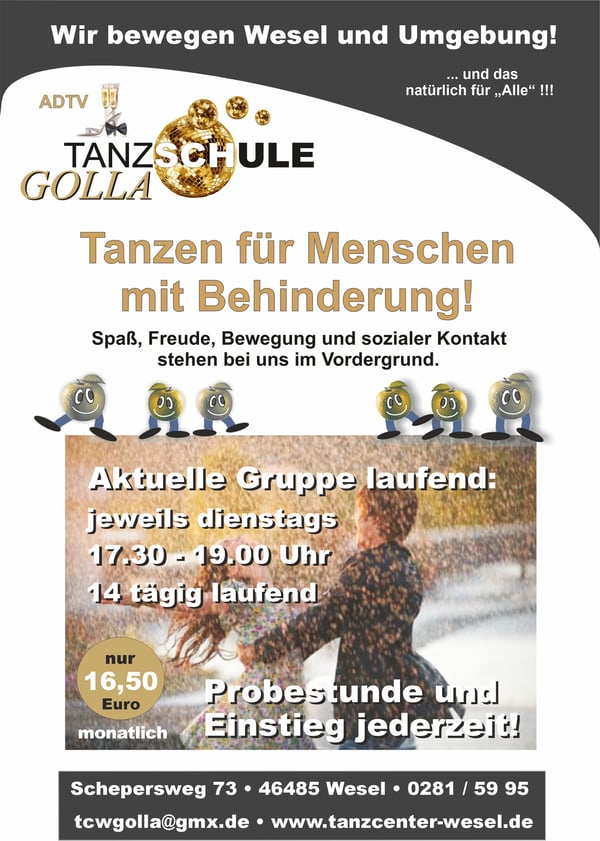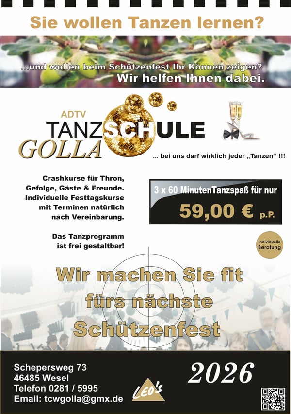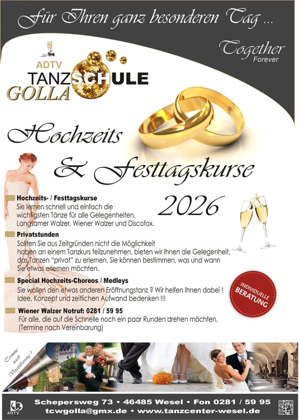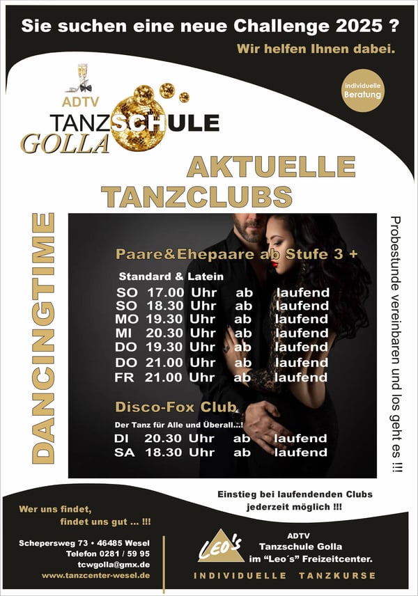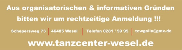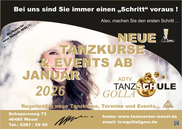 +++ Die 1. Hälfte des Tanz-Jahres 2065 läuft bald an, also Zeit um sich neu zu orientieren !!! +++ Wir starten 2026 so richtig durch !!! +++ Das 1. Tanzhalbjahr 2026 wird einfach grandios !!! +++ Neue Tanzkurstermine ab Januar 2026 in Kürze online! Schnell schon Kursplatz sichern!!! +++ Neuer Veranstaltungskalender online ! +++ Wir haben das richtige Geschenk für alle Gelegenheiten: "Geschenkgutscheine" für alle Gelegenheiten jederzeit im Büro erhältlich!!! +++ Gutscheine auch Online buchbar +++ Nächstes Event: "Alle Tanz-Parties und Events finden natürlich wieder wie gewohnt statt!!! " +++ Die Geschenkidee!!! Wie wäre es mit einer Privatstunde nach Wahl??? +++ Wir wünschen allen Besuchern unserer Homepage viel Spaß beim Stöbern auf unserer Homepage !!! +++
